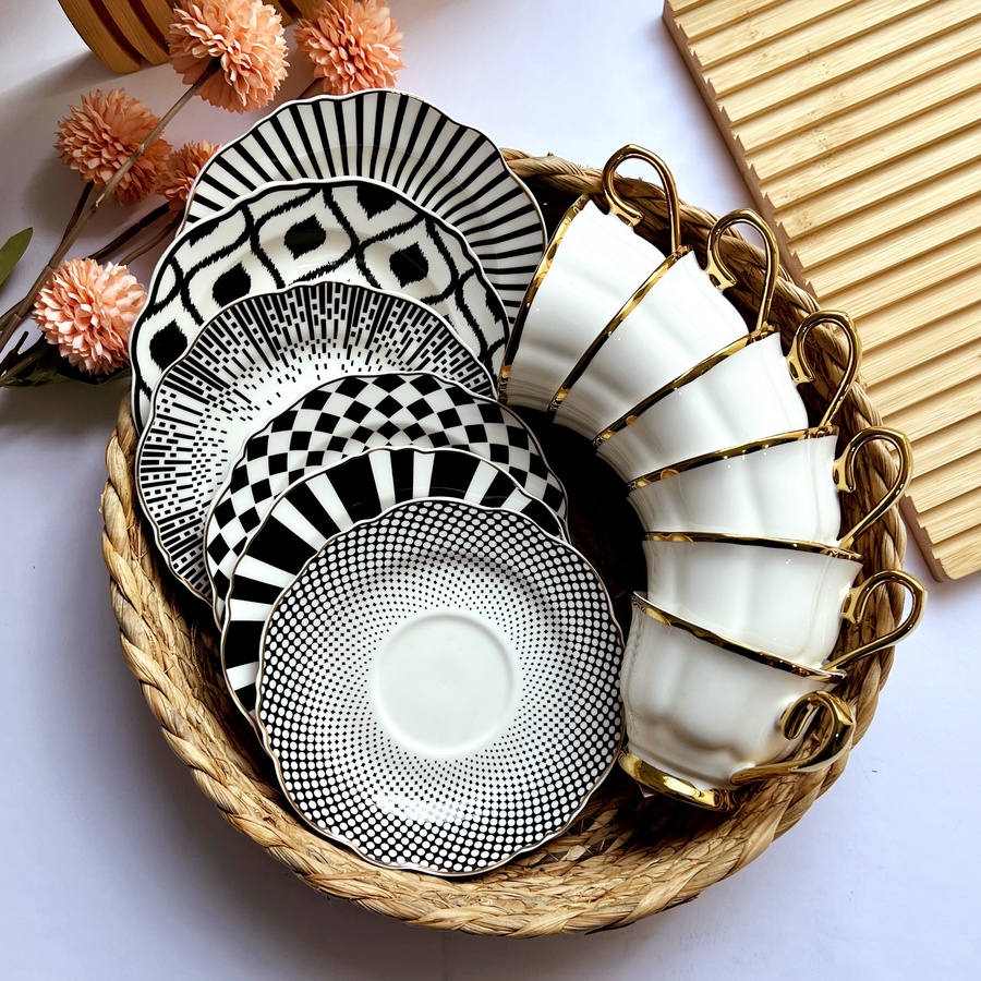 فنجان يجمع بين الأناقة الكلاسيكية واللمسة العصرية تصميمه بخطوط سوداء راقية تحيط بالطبق كأشعة فخمة، وتفاصيله الذهبية تضيف لمسة من الفخامة والأناقة