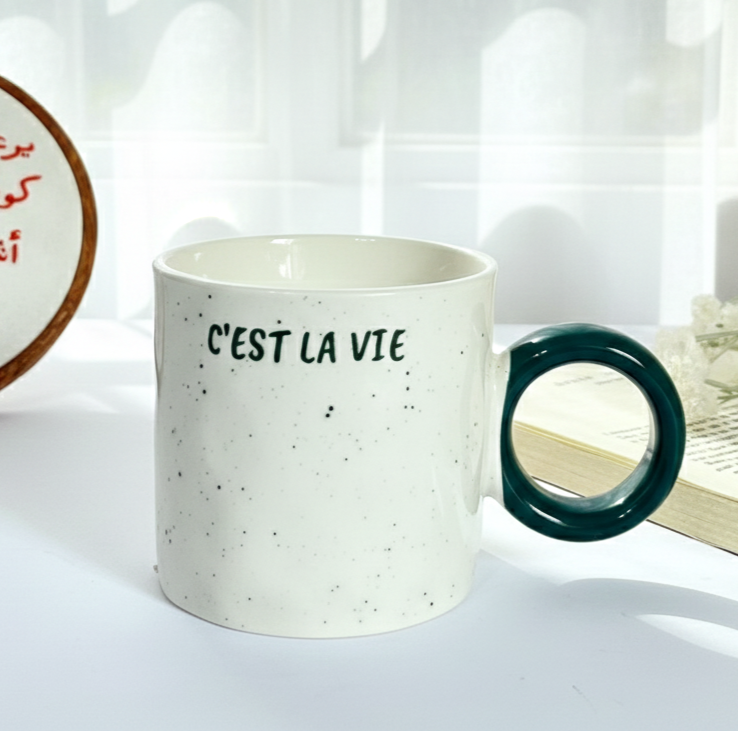 مج اسبريسو بشكل كلاسيك باللون الأبيض منقط أسود ويد ملونة