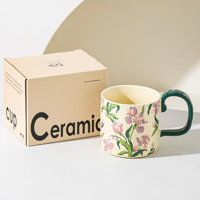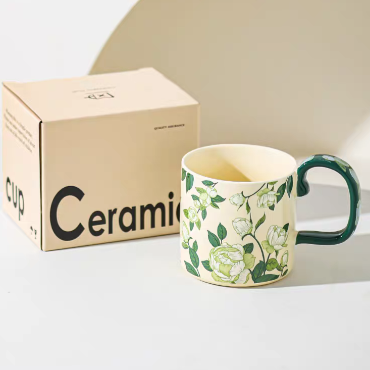 مج مميز يجمع بين هدوء الورود الخضراء ورقة الورود الموف على خلفية أوف وايت أنيقة. مجات بسيطة وناعمة بتضيف لمسة من البهجة والصفاء ليومك