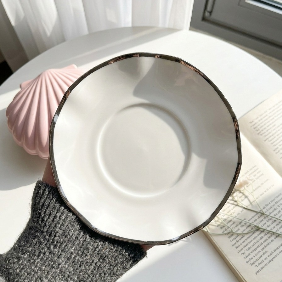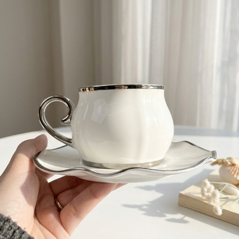 فنجان يعكس نقاء اللون الأبيض يحيطه إطار فضي لامع يضيف لمسة هادئة من الفخامة قطعة تجمع بين النقاء والتألق في توازن مثالي ✨