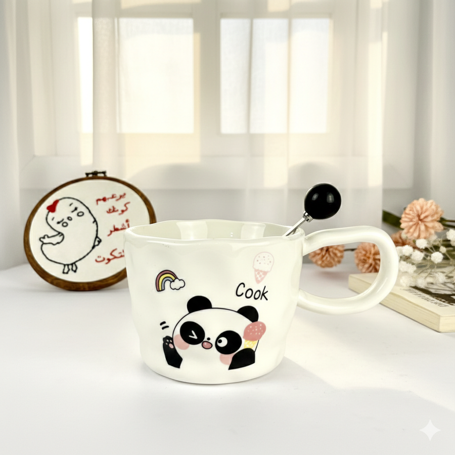مج مميز عليه رسمة باندا كيوت ومعاه معلقة بشكل واسع مناسب لمشروبك المفضل
