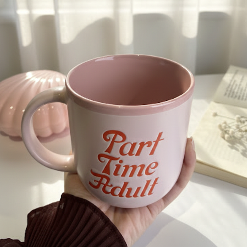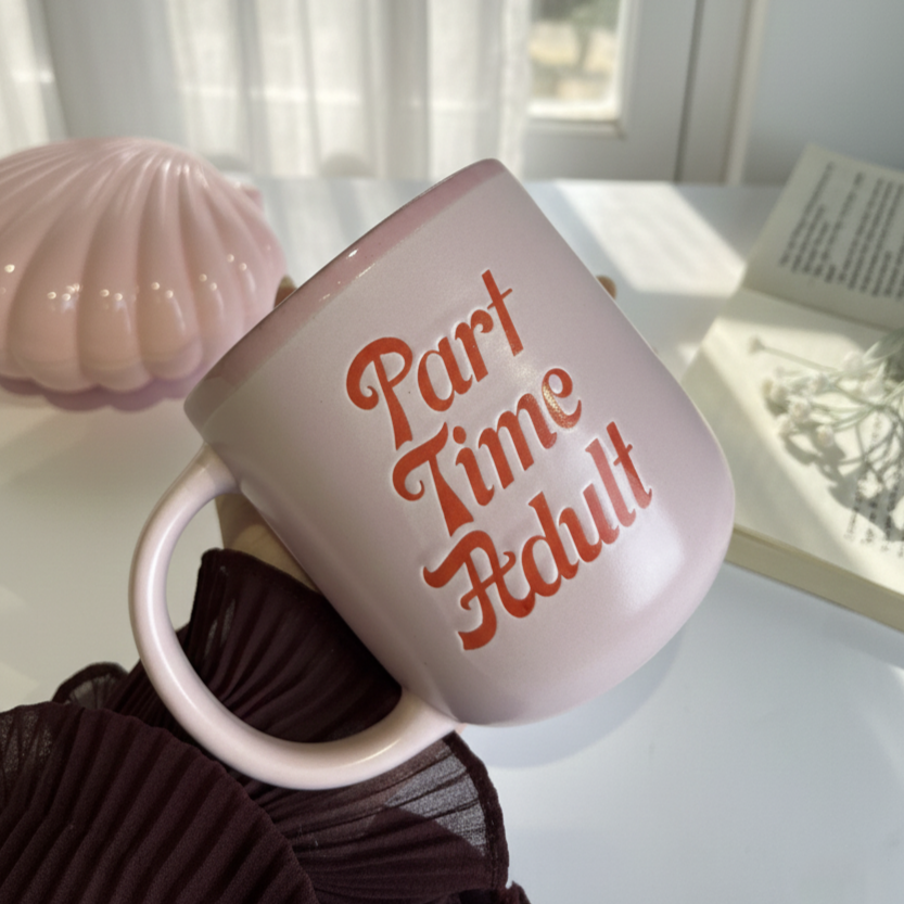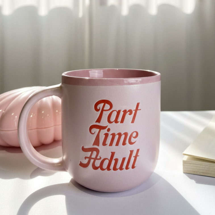 مج لطيف باللون البينك ومكتوب عليه جملة part time adult عشان يعبر عنك