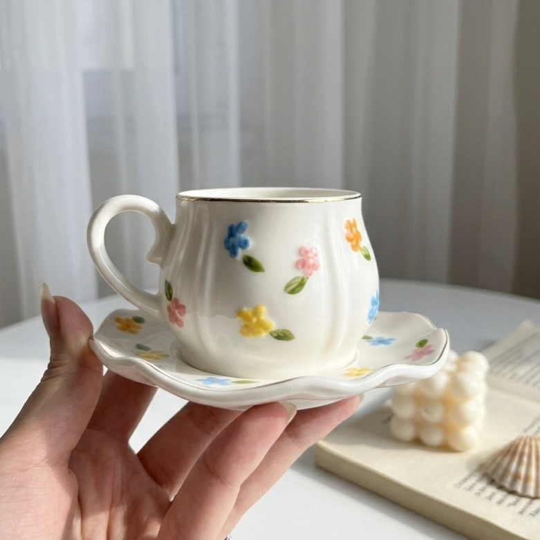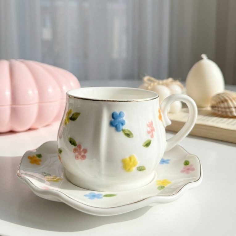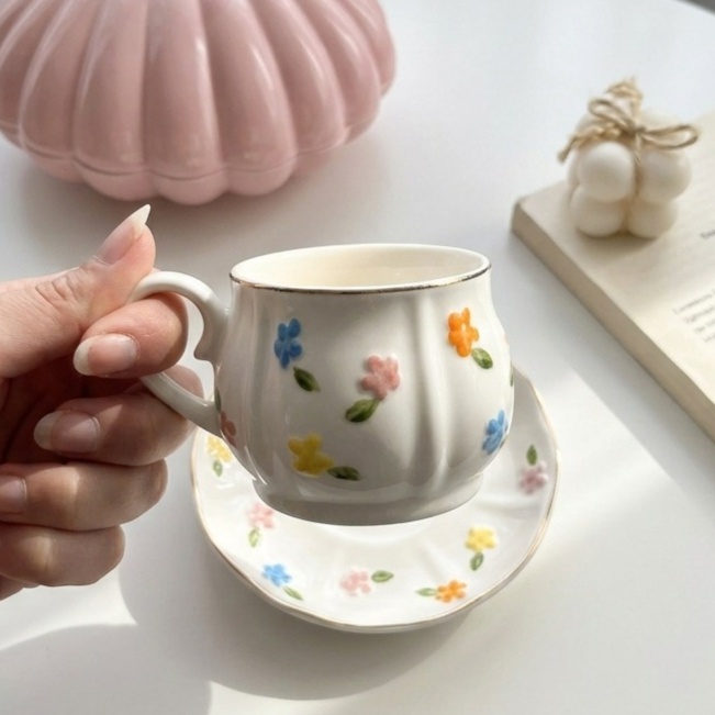 فنجان بورود صغيرة بارزة ملوّنة بدرجات الباستيل الهادية، بيدي إحساس لطيف ومبهج كأنه حديقة صغيرة حوالين الفنجان 💕🌷