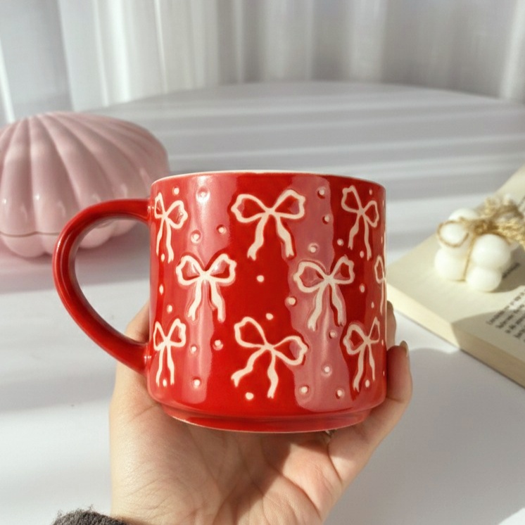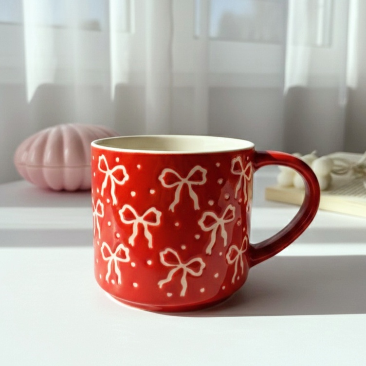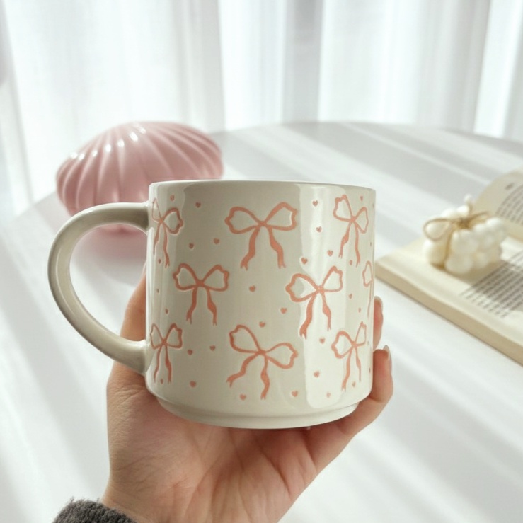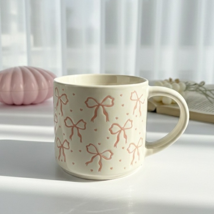 مج بتصميم أنثوي أنيق يجمع بين رسومات الفيونكات الرقيقة والنقاط الناعمة في تناغم بسيط، التفاصيل المرسومة تضيف لمسة ناعمة