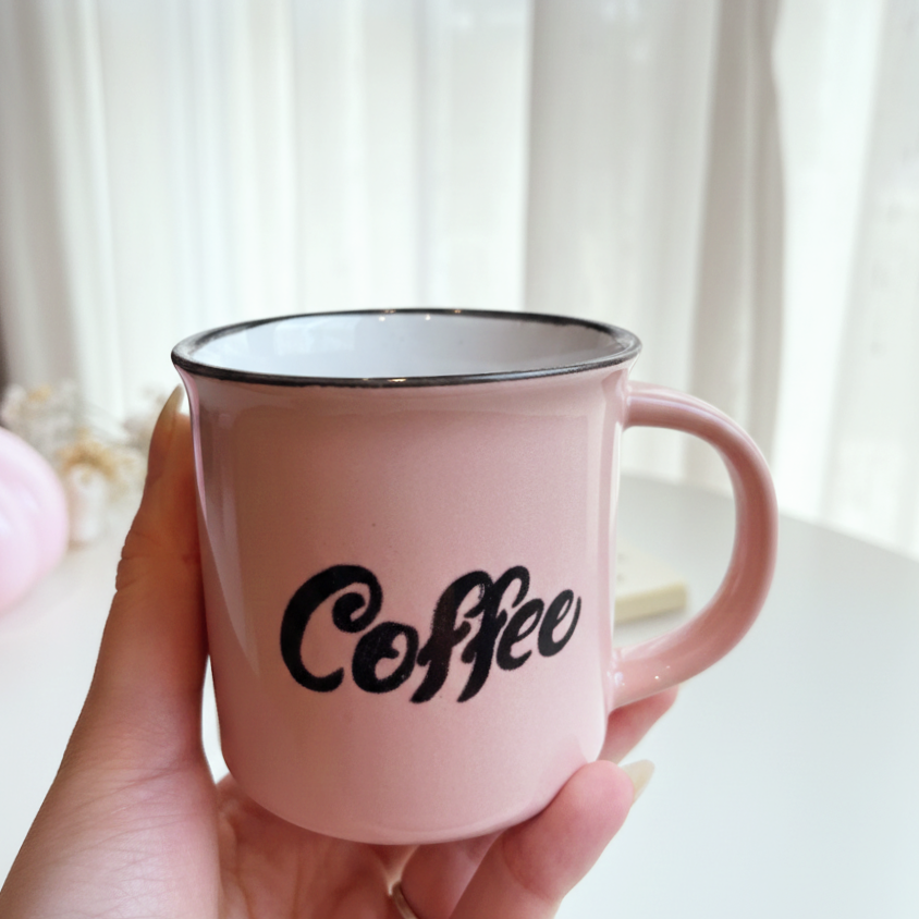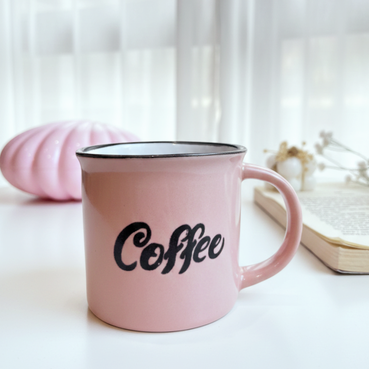 مج بلون بينك مكتوب عليه كلمة coffee حجمه مناسب للقهوة والإسبريسو