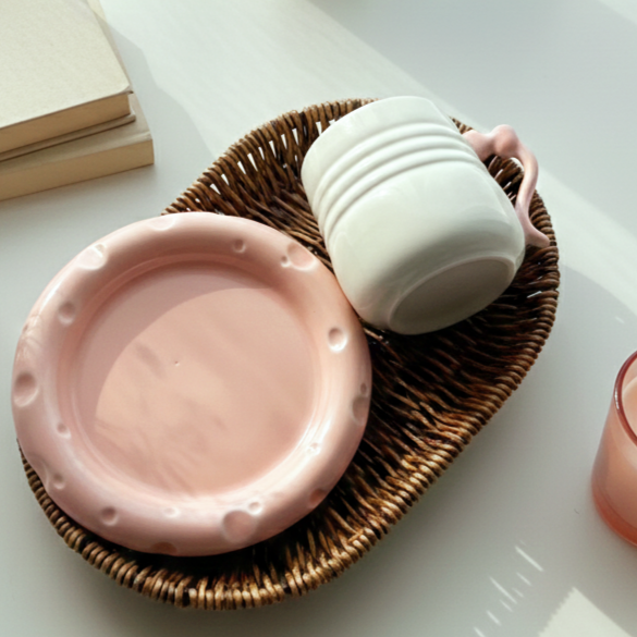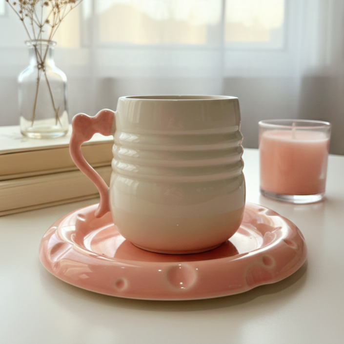 فنجان كيوت بلون أبيض وبينك والطبق بتاعه على شكل قمر هيبقى هدية لطيفة وبداية مميزة ليومك