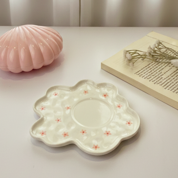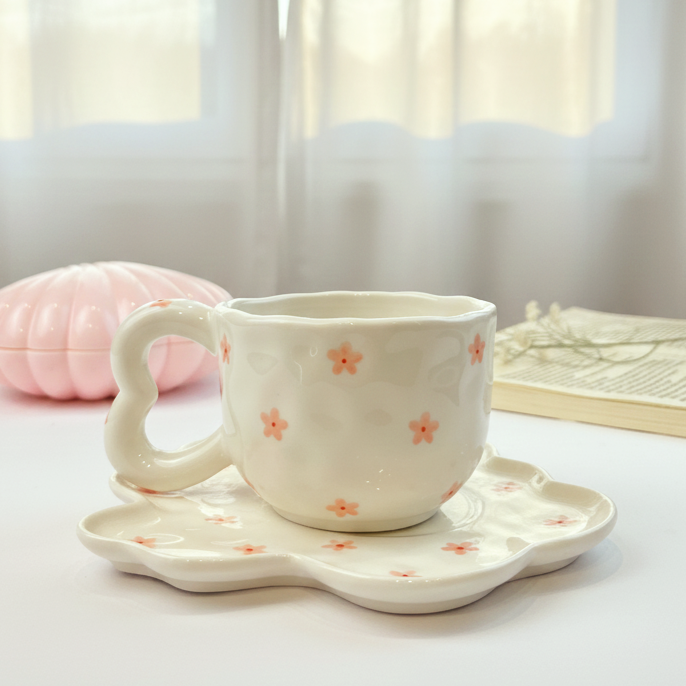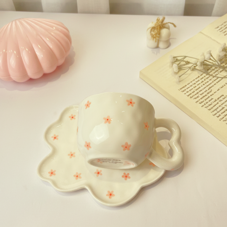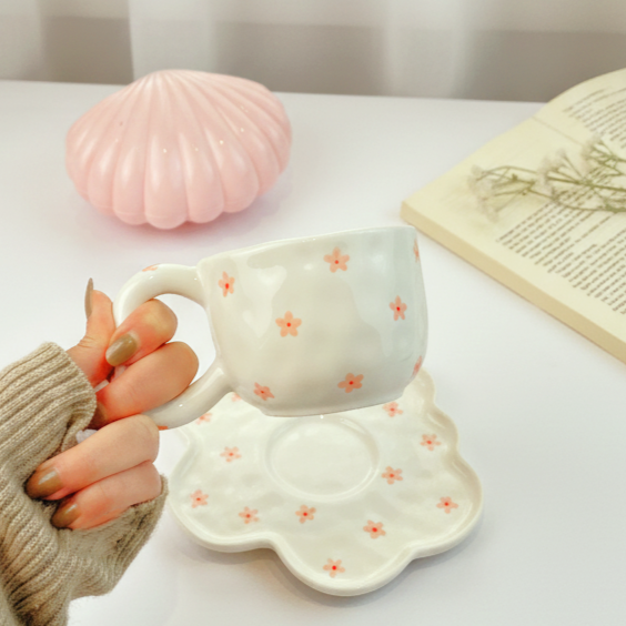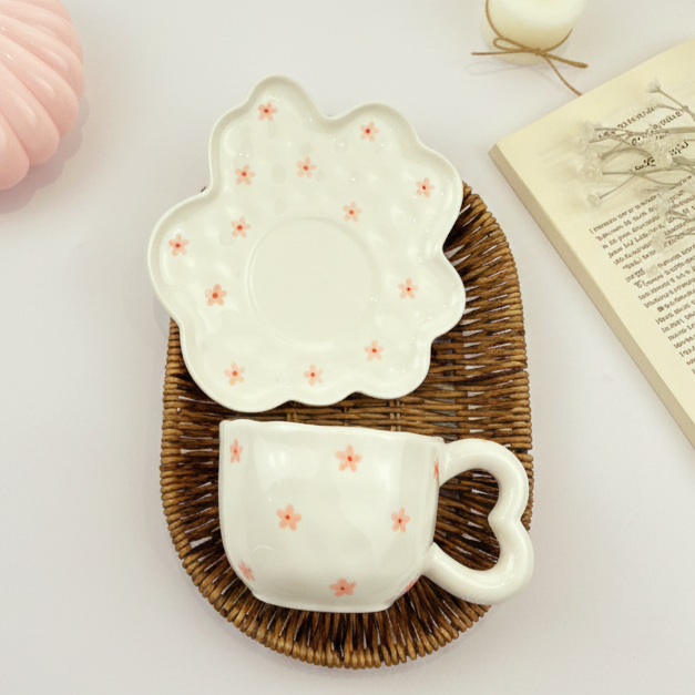 مج لطيف بالطبق مرسوم عليه ورود بينك صغيرة وجميلة مناسب لمشروبك المفضل ويمكن استخدام الطبق ك كوستر