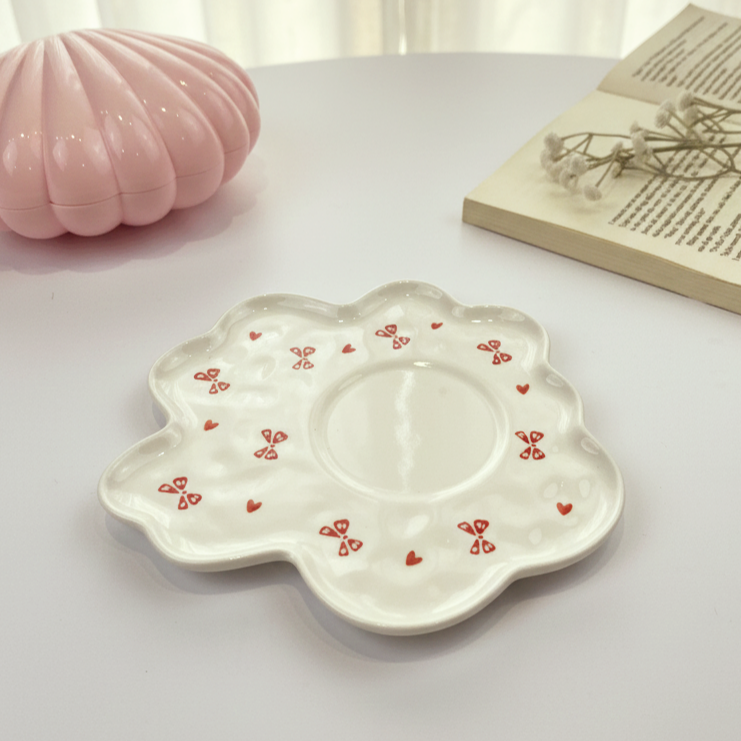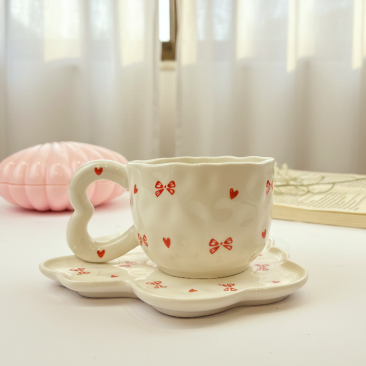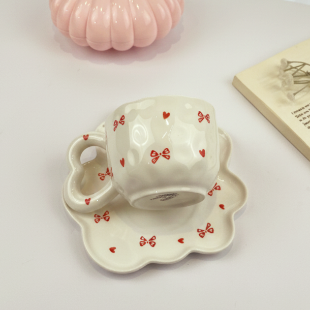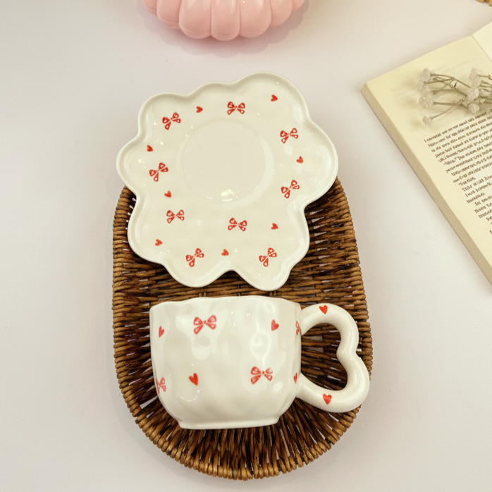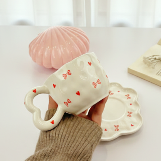 مج لطيف بالطبق مرسوم عليه فيونكات وقلوب مناسب لمشروبك المفضل ويمكن استخدام الطبق ك كوستر