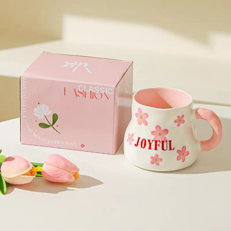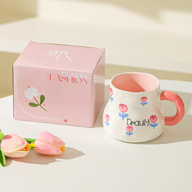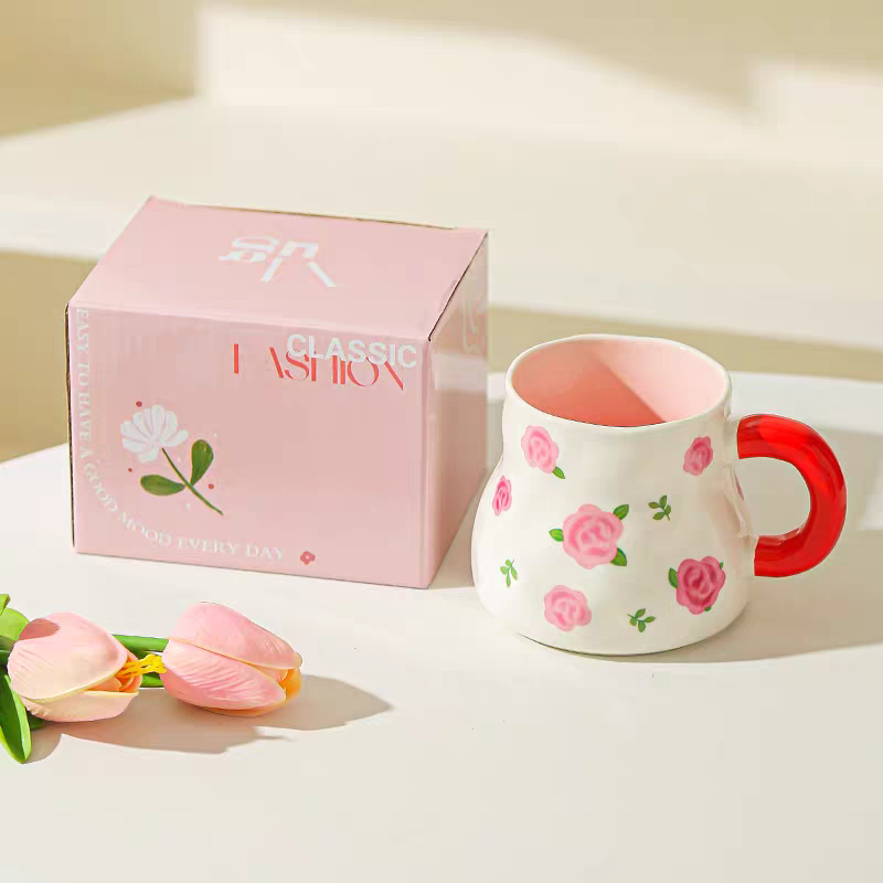 مج عليه رسومات ورد بطول المج باللون البينك ويد باللون الأحمر هيبقى بداية لطيفة ليومك