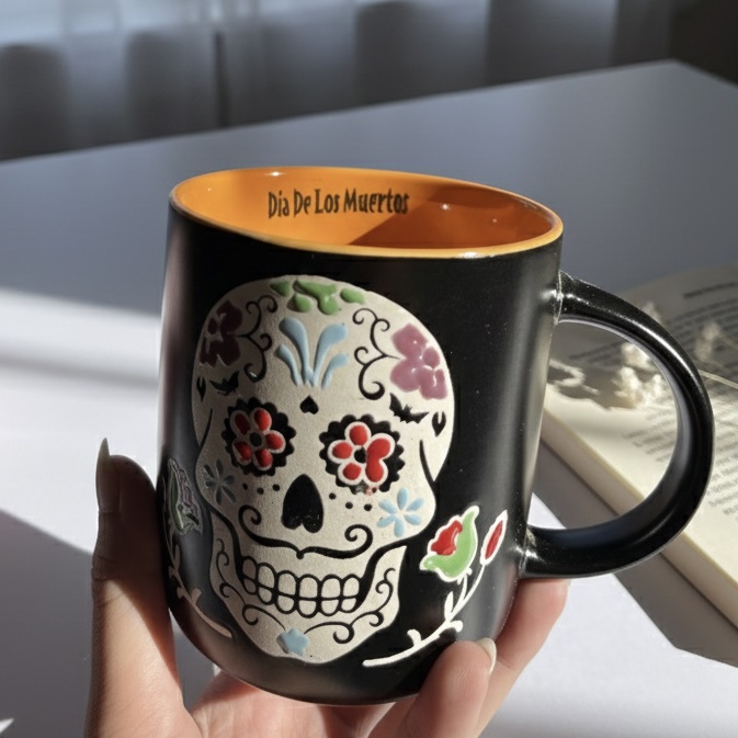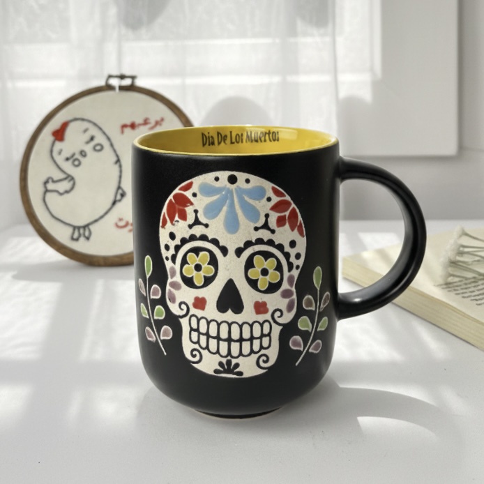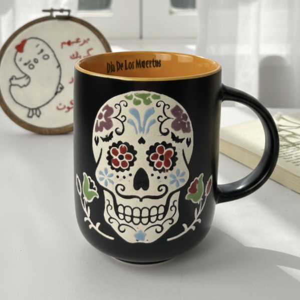 مج عليه رسمة جمجمة ومزينة بالورود شكله مختلف ومميز