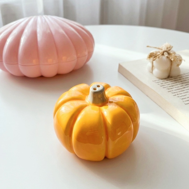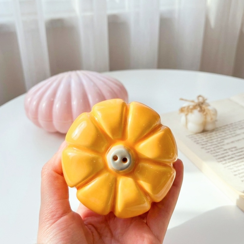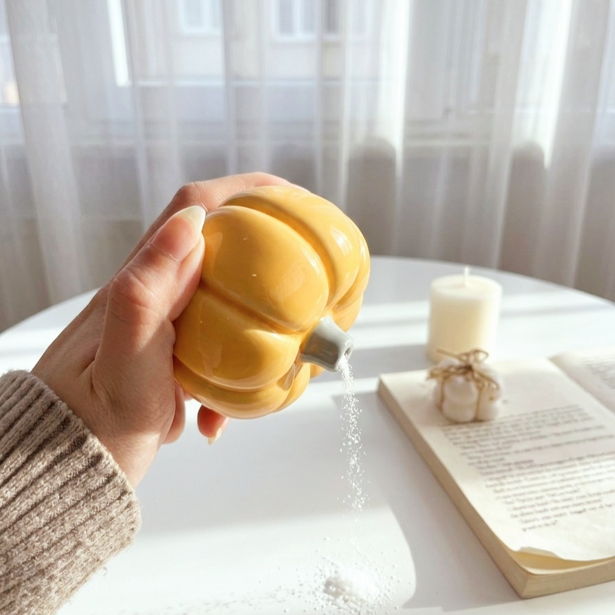 ملاحة بتصميم كيوت مستوحى من شكل القرع، باللون الأصفر الدافئ اللي بيدي إحساس بالراحة والدفا. حجمها صغير وعملي، مثالية لرش الملح بسهولة ولمسة أنيقة على سفرتك