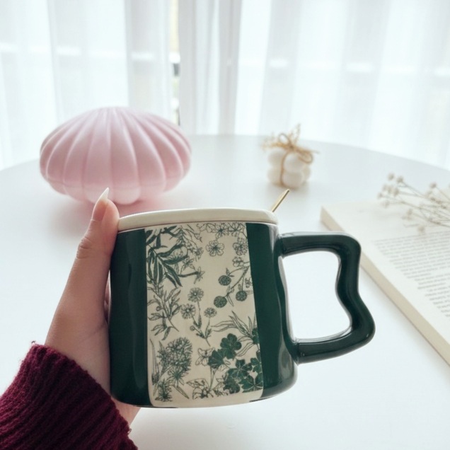مج بلون أخضر وبيچ ومزين بالورود فيه لمعة وشكله مميز