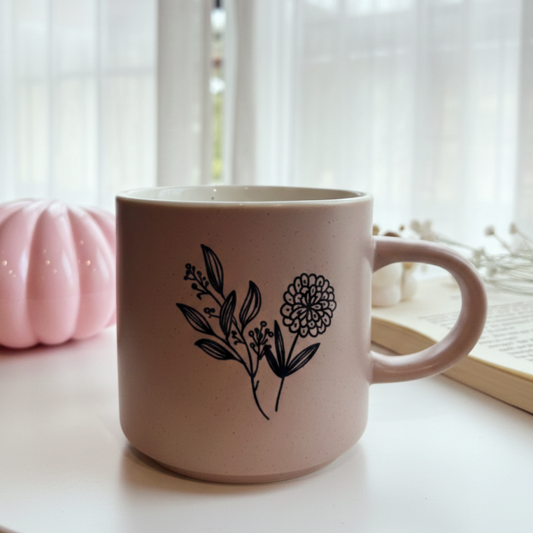 مج بلون كافيه وعليه وردة باللون الأسود شكله كلاسيك وأنيق
