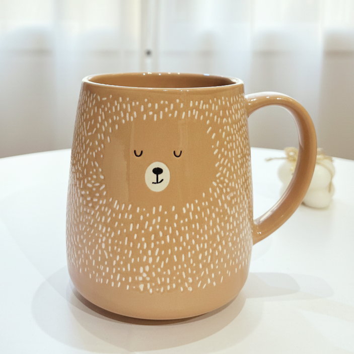 مج بلون شتوي دافي وعليه رسمة دبدوب حجمه كبير وشكله مميز