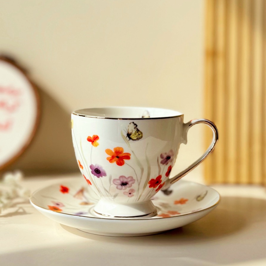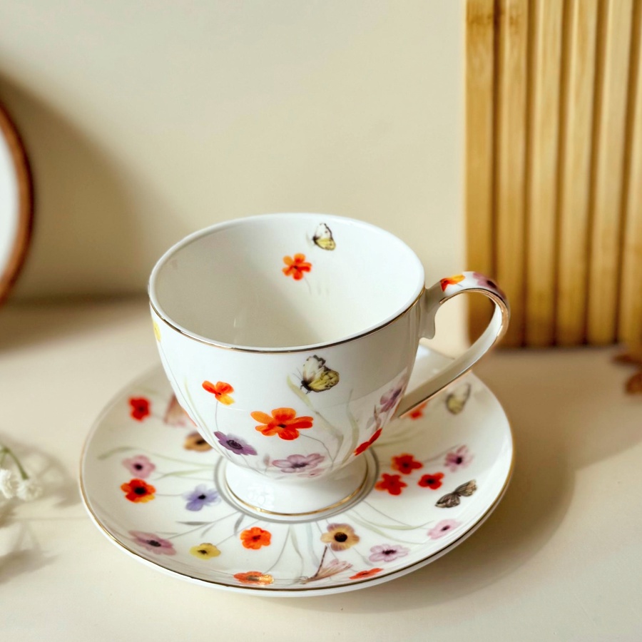 فنجان شبه أشعة الشمس المشرقة مرسوم عليه ورد بألوان مبهجة وفراشات كأنها بتطير حواليه، ولمسة دهبي على الحواف بتزود الشياكة