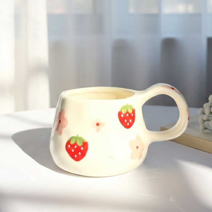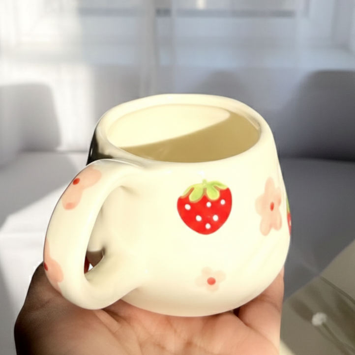 مج لطيف مرسوم عليه ورد وفراولة بطول المج وإيده مزينة بالورد