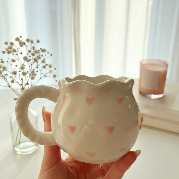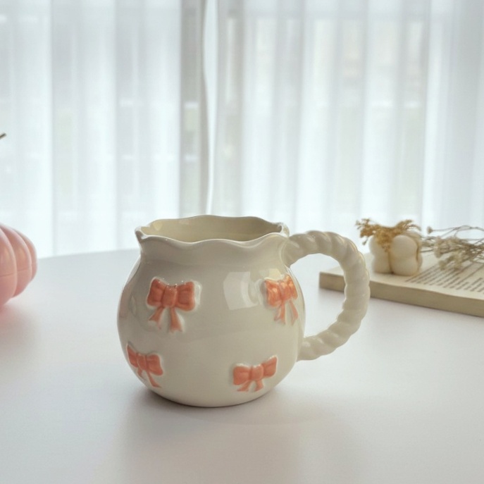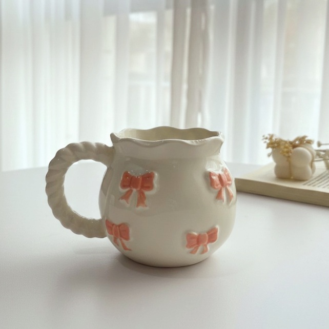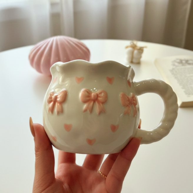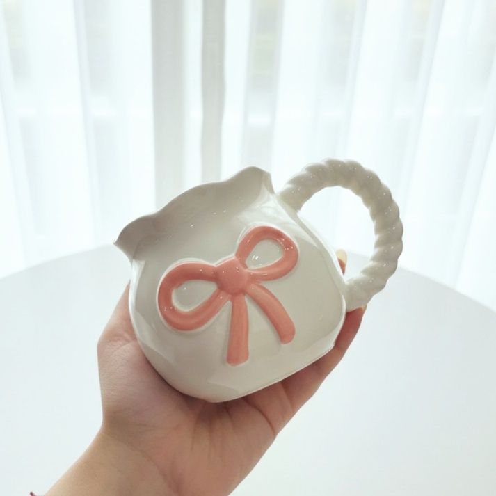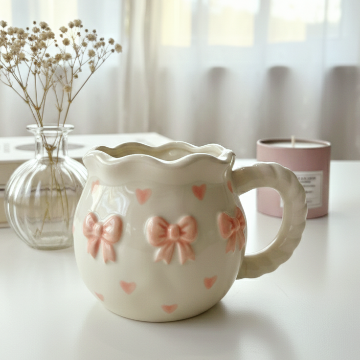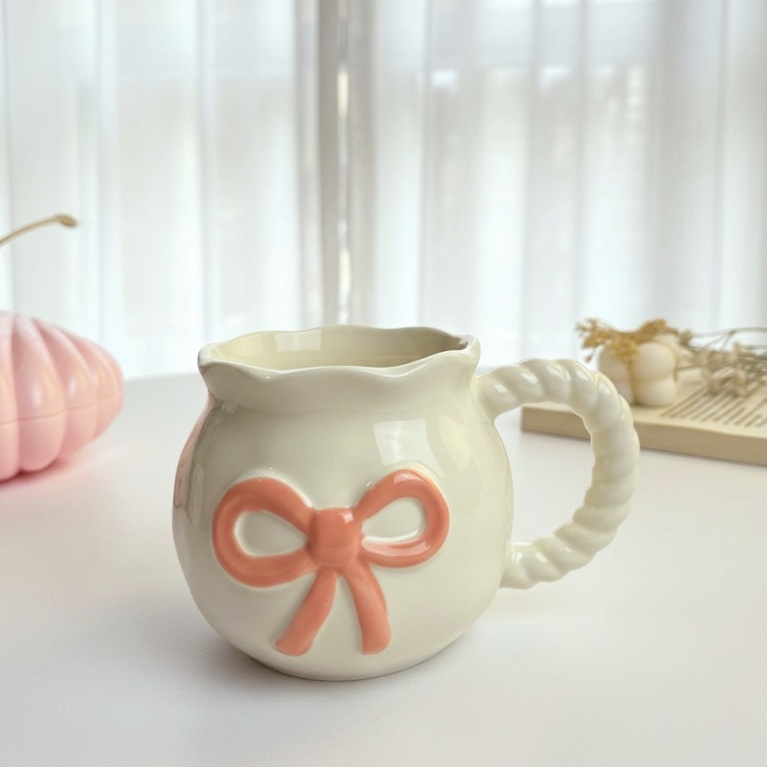 مج بلون أوف وايت ورسومات فيونكة رقيقة هيخليكي تستمتعي بمشروبك المفضل