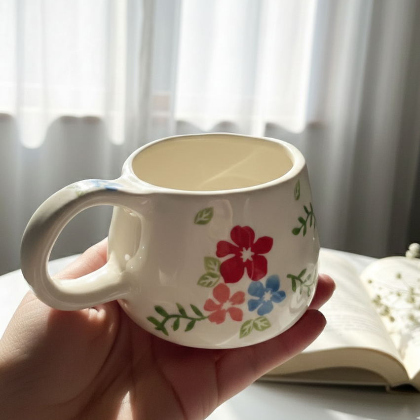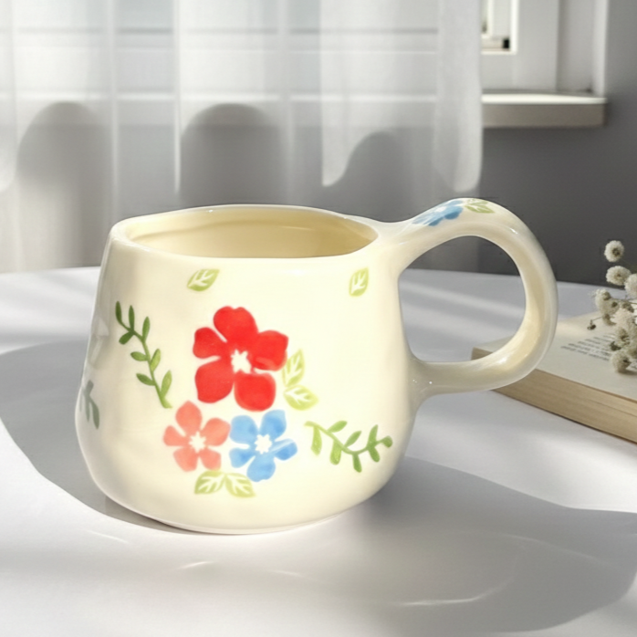مج لطيف مرسوم عليه ورد ملون بطول المج وإيده مزينة بالورد