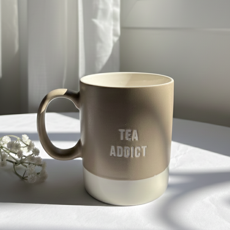 مج بورسلين بحجم كبير مكتوب عليه tea addict والشكل التاني coffee lover عشان يناسب ذوقك