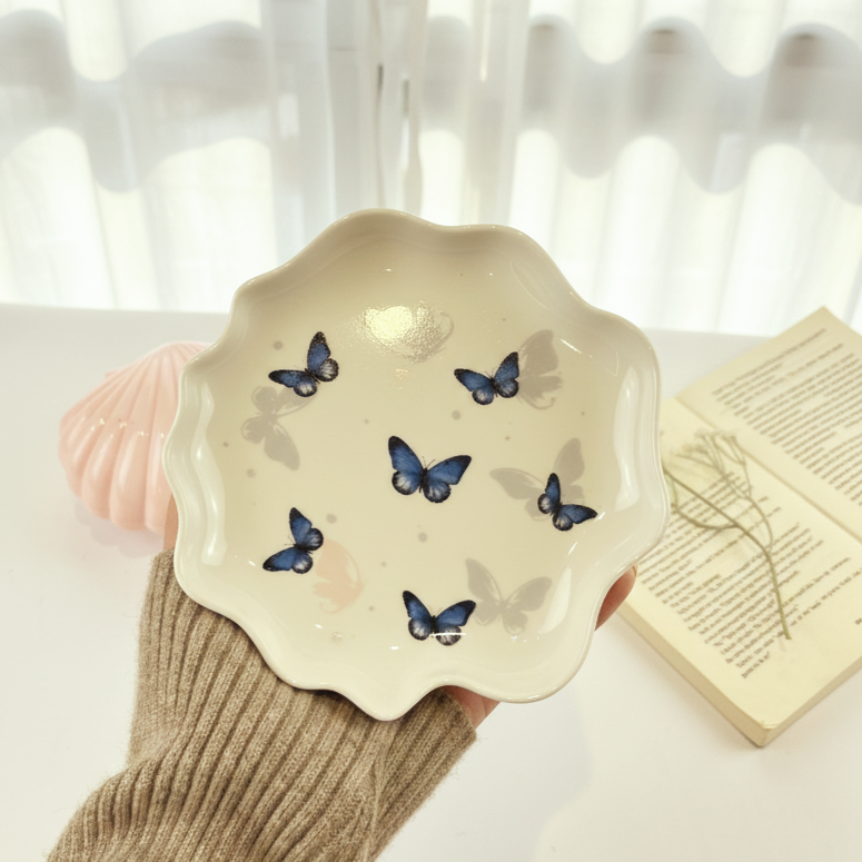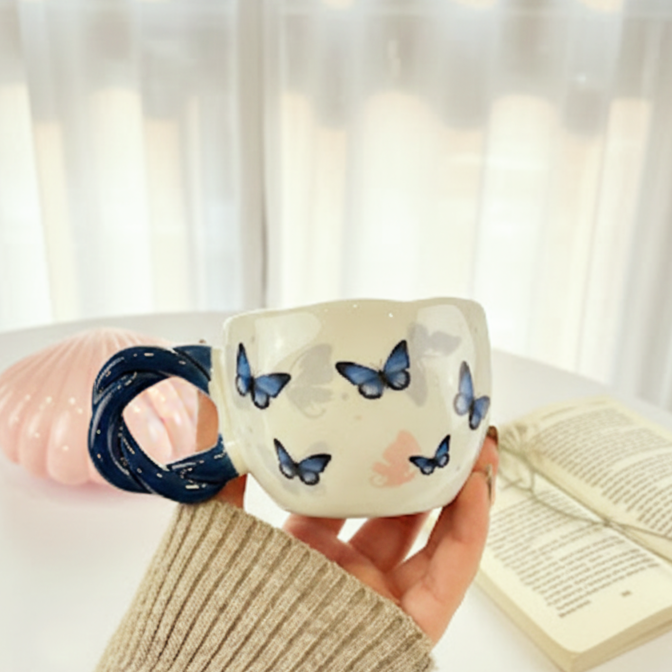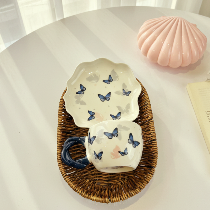 فنجان عليه فراشات باللون الأزرق وشكل إيده مميز معاه طبق يمكن استخدامه ك كوستر