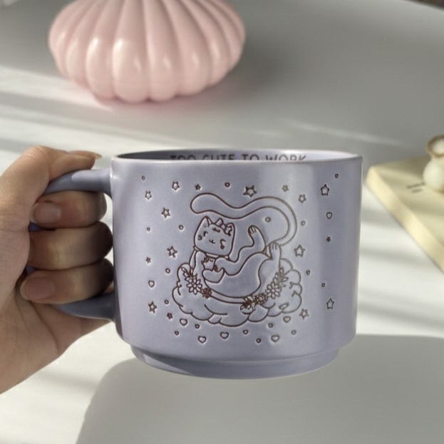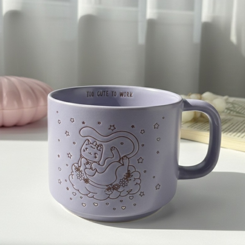 مج بلون موف وعليه رسمة قطة مكتوب جواه too cute to work عشان يعبر عنك