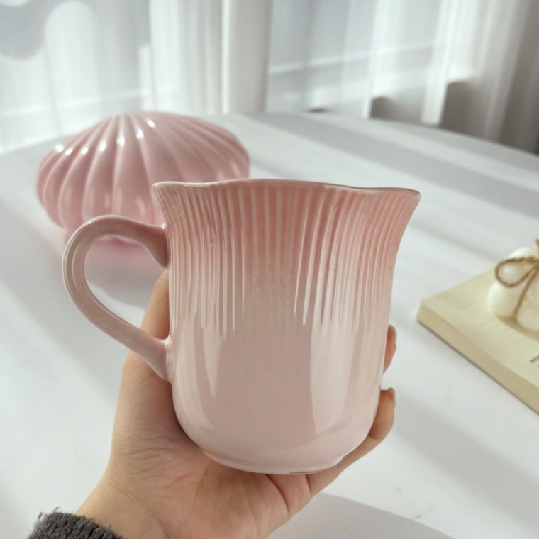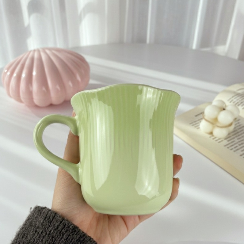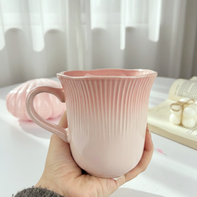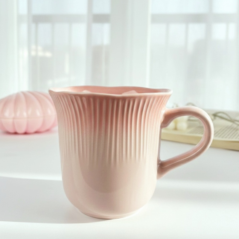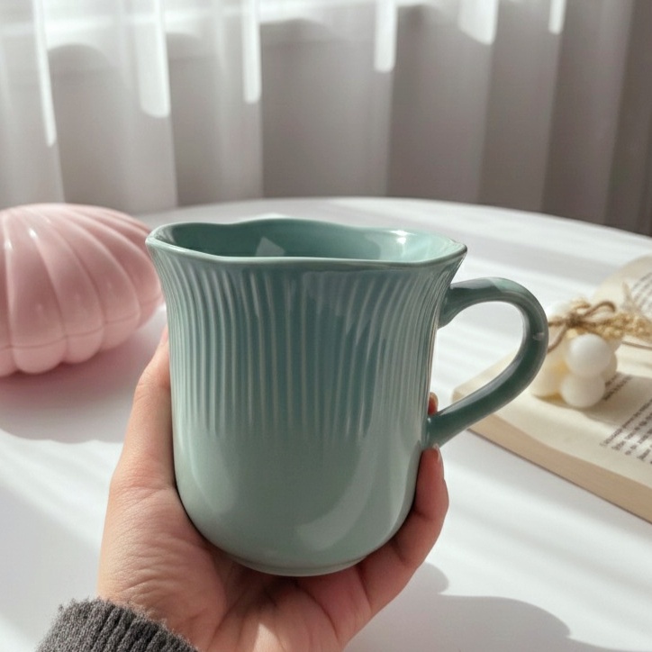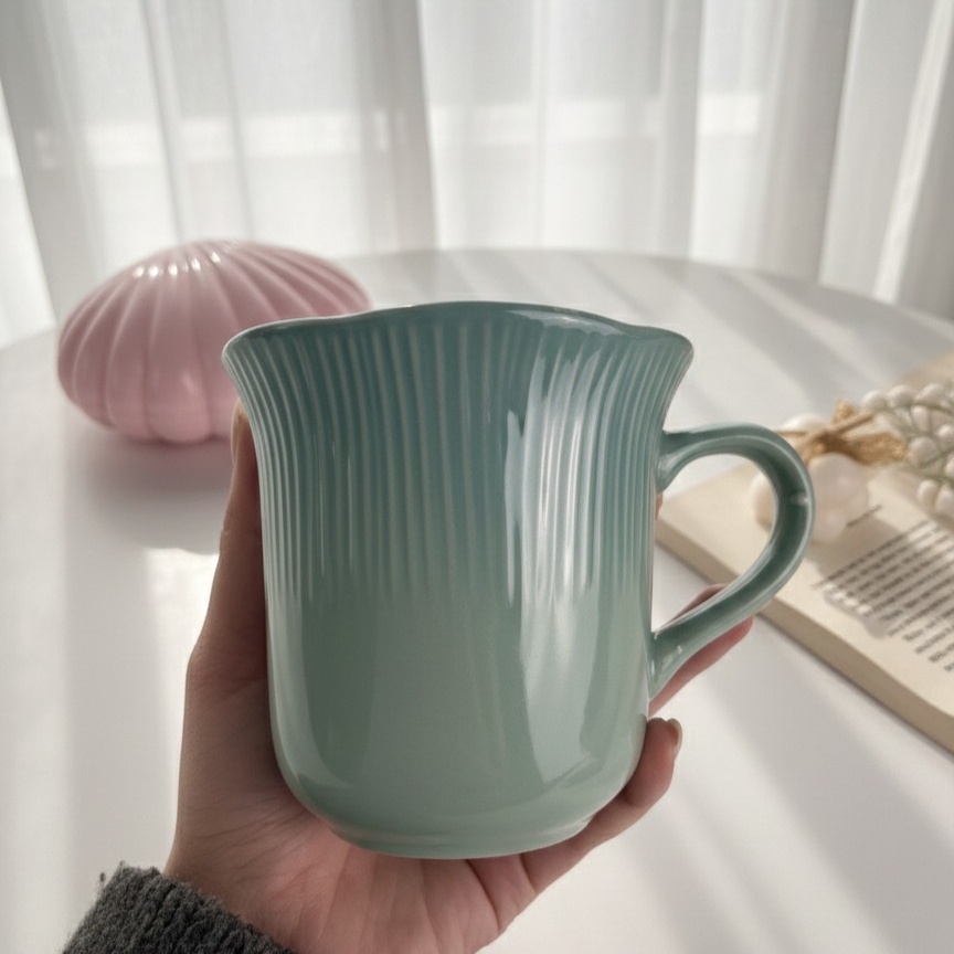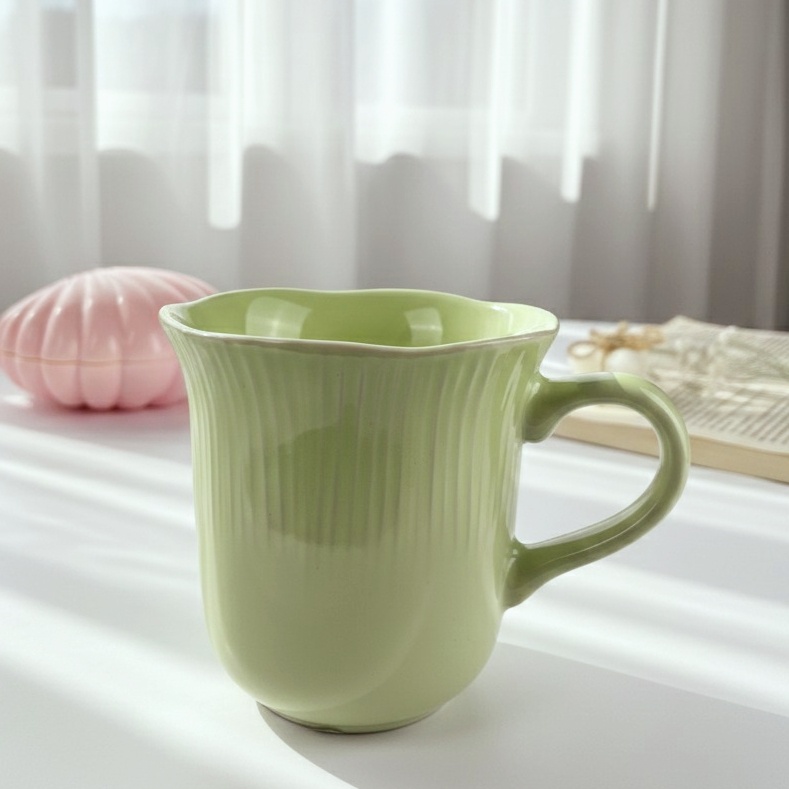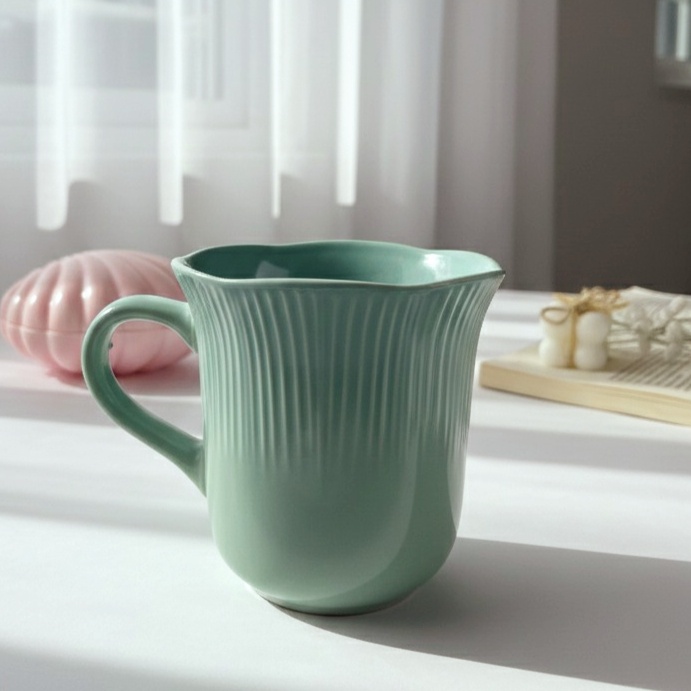مج بألوان باستيل هادئة التصميم يتميز بخطوط طولية بارزة تضيف ملمسًا أنيقًا شكل المج واسع من الأعلى بانحناءة رقيقة تمنح إحساسًا بالدفء والراحة