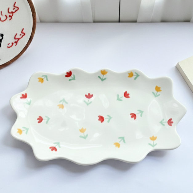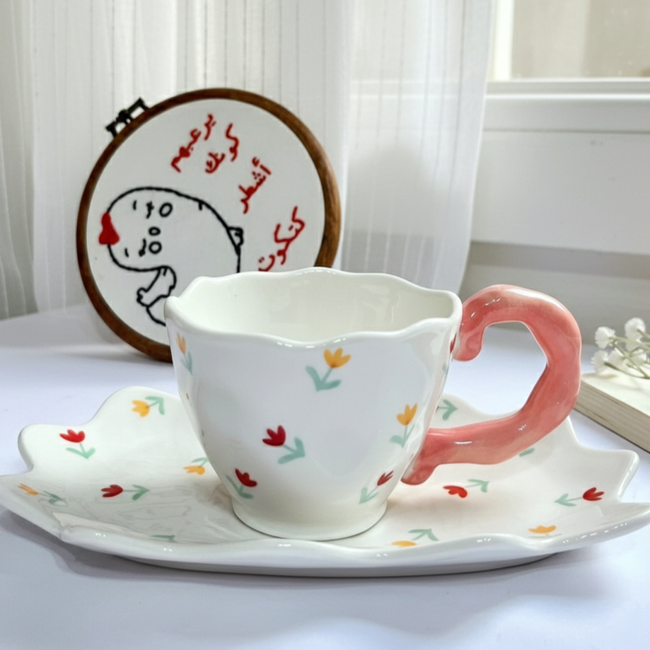 طقم فنجان وطبق بتصميم متموّج ولمسات من زهور التوليب الصغيرة. ألوانه ناعمة وتفاصيله مبهجة هيديكي إحساس بالسعادة في كل مرة تستخدميه فيها 🌷