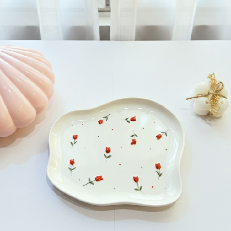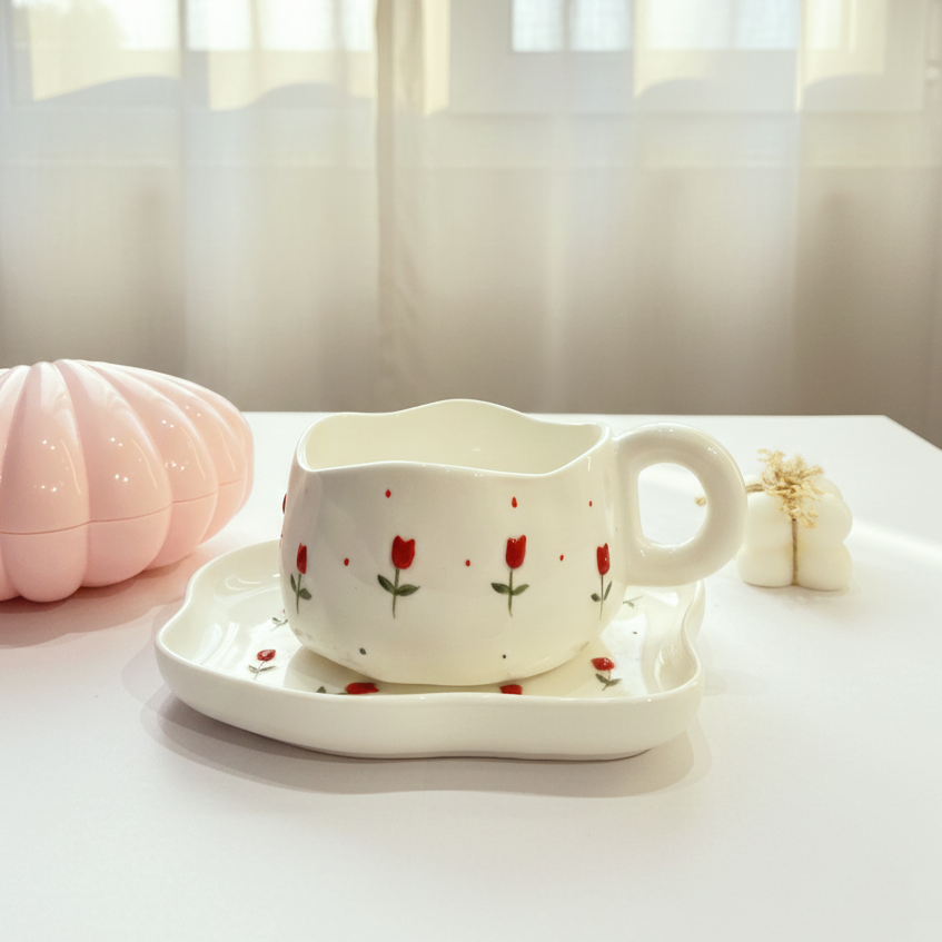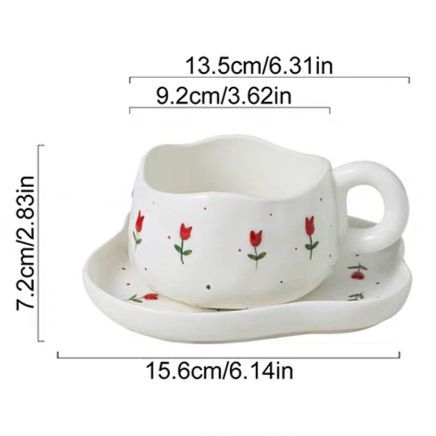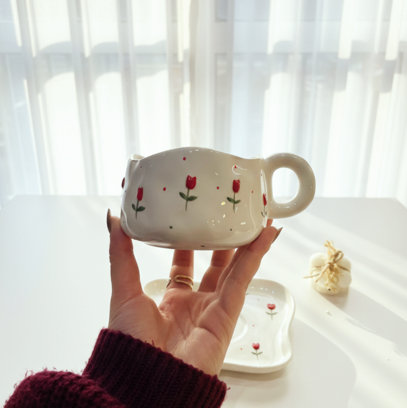 مج لطيف بالطبق مرسوم عليه ورد تيوليب أحمر ليه ملمس بارز مناسب لمشروبك المفضل ويمكن استخدام الطبق ك كوستر