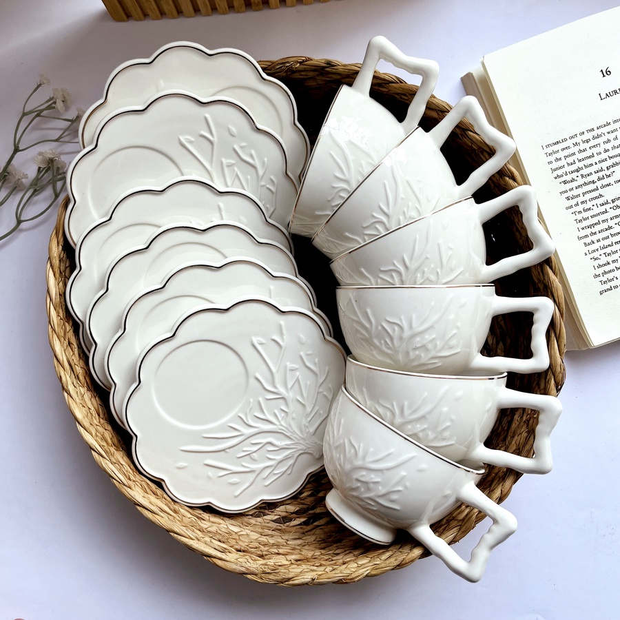 فنجان ناعم على شكل غصن الشجر بلون أبيض أنيق وملمس بارز للشجر بسيط وأنيق