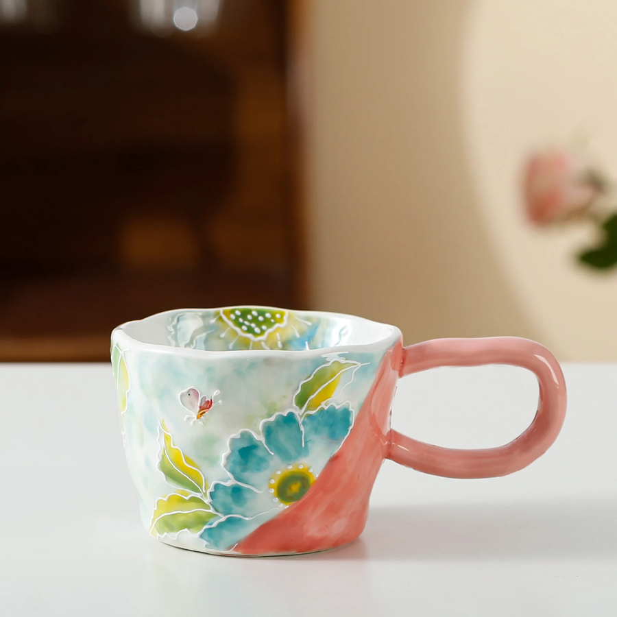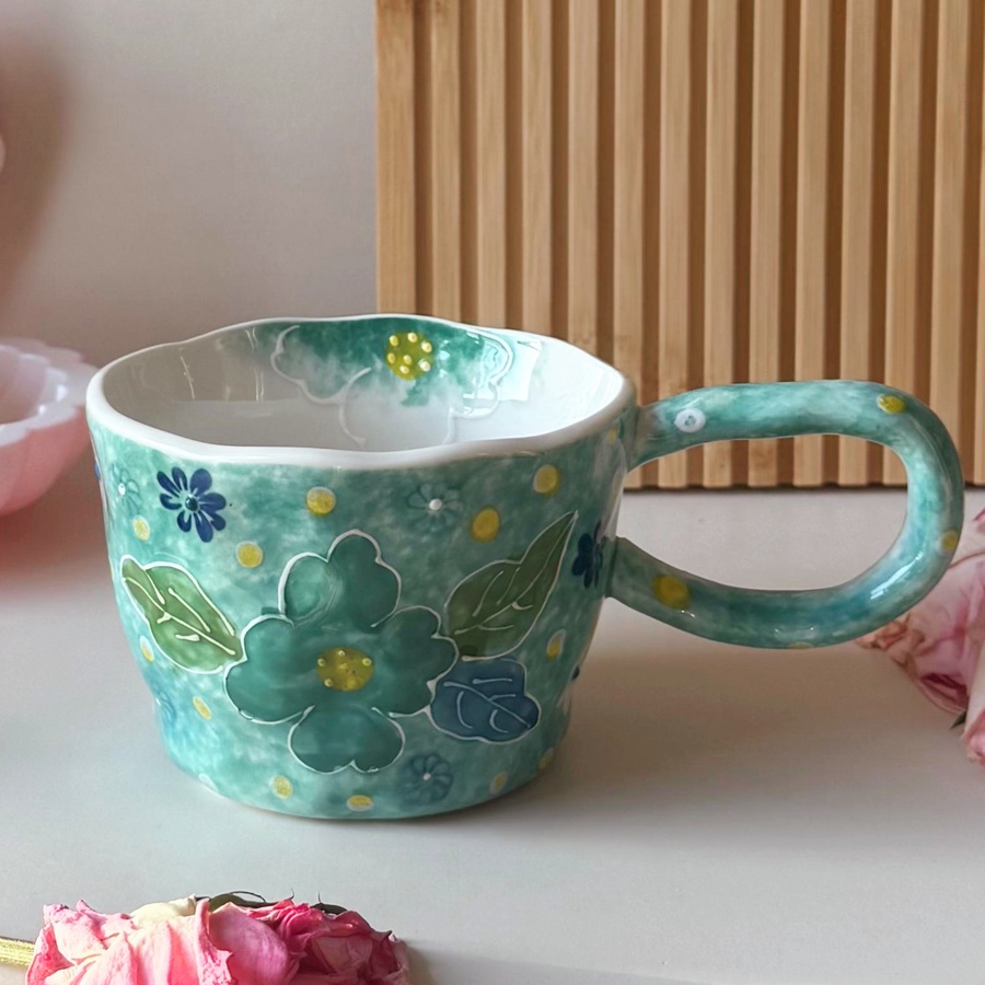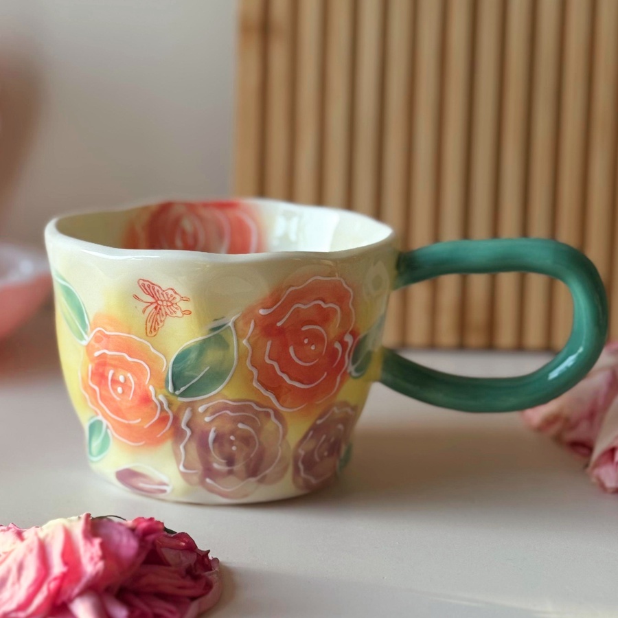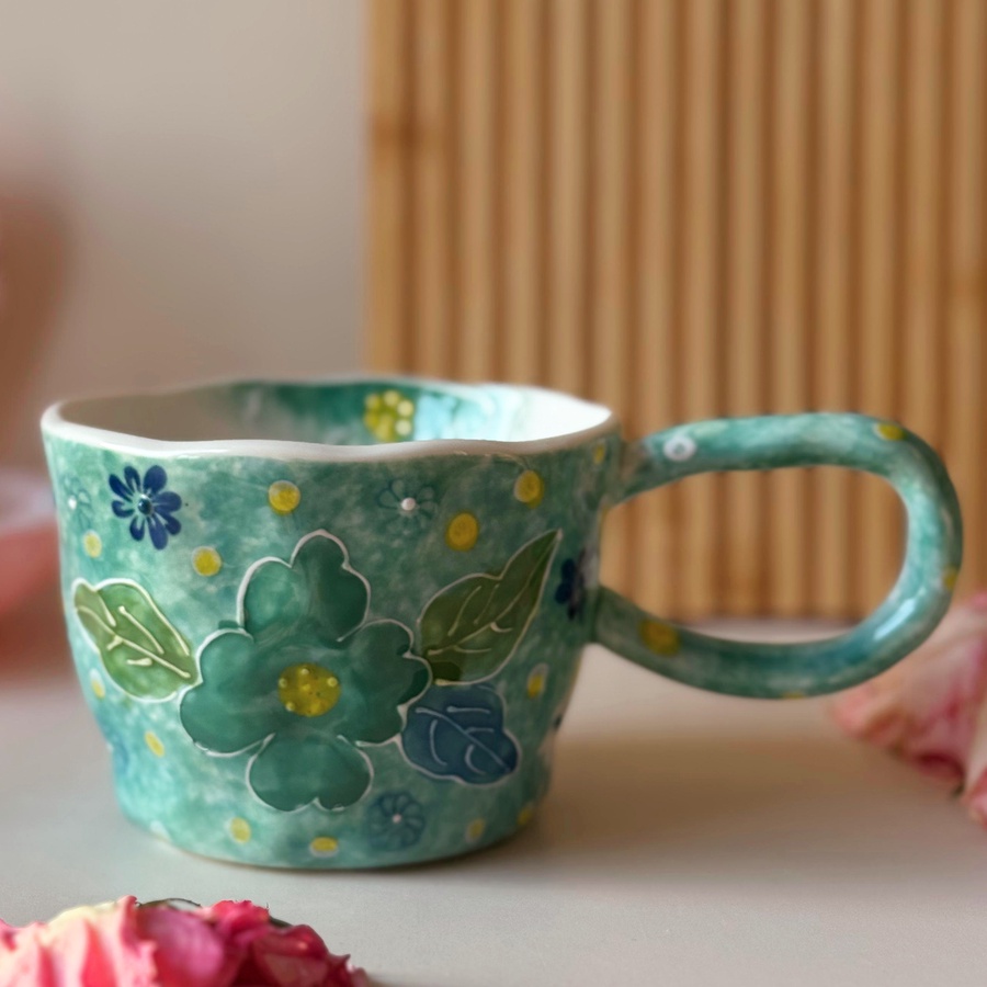 مج Velora هو قطعة من البساطة الأنيقة برسومات ورد مبهجة وبارزة تصميمه المتوفر باللونين الأخضر والأصفر مع لمعة ناعمة يضيف لمسة راقية لكل لحظة