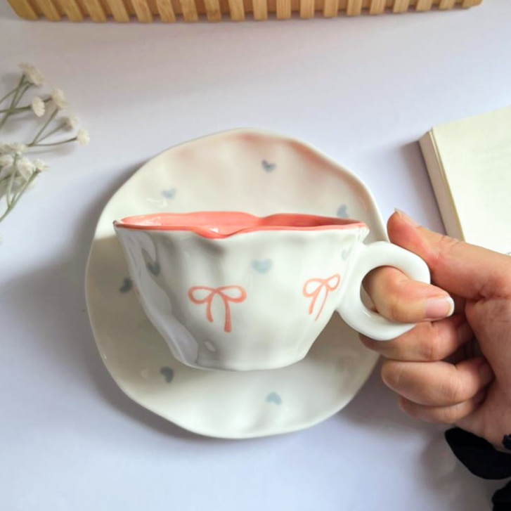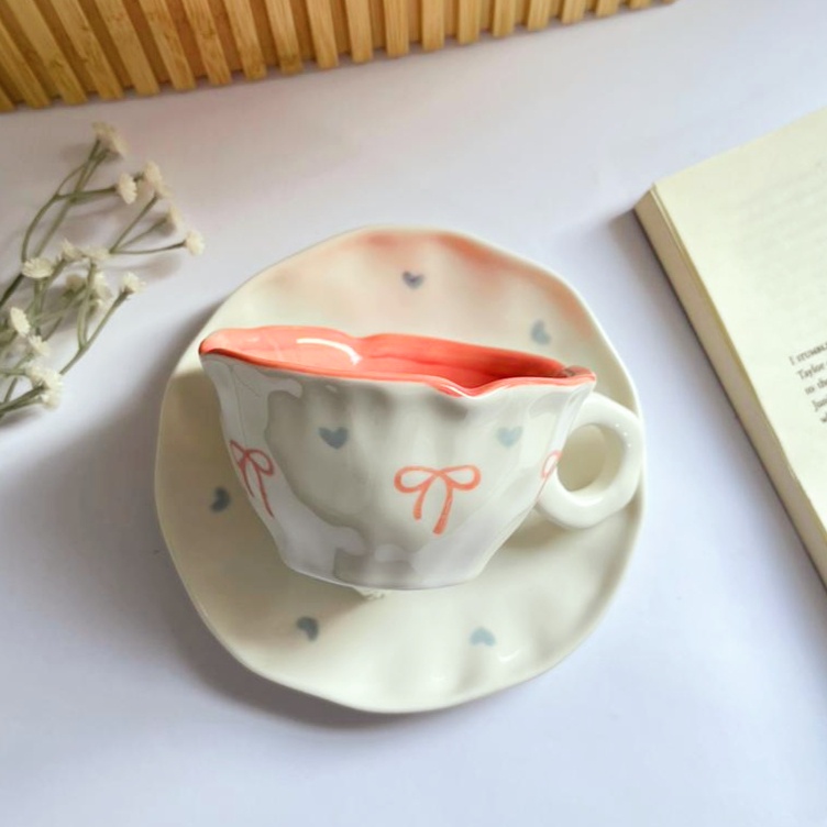 مج ناعم وأنيق تصميمه مزيّن بفيونكات صغيرة وقلوب ناعمة لونه من الداخل وردي دافئ ومن الخارج كريمي هادئ هيخليكي تستمتعي بمشروبك المفضل 🎀☕