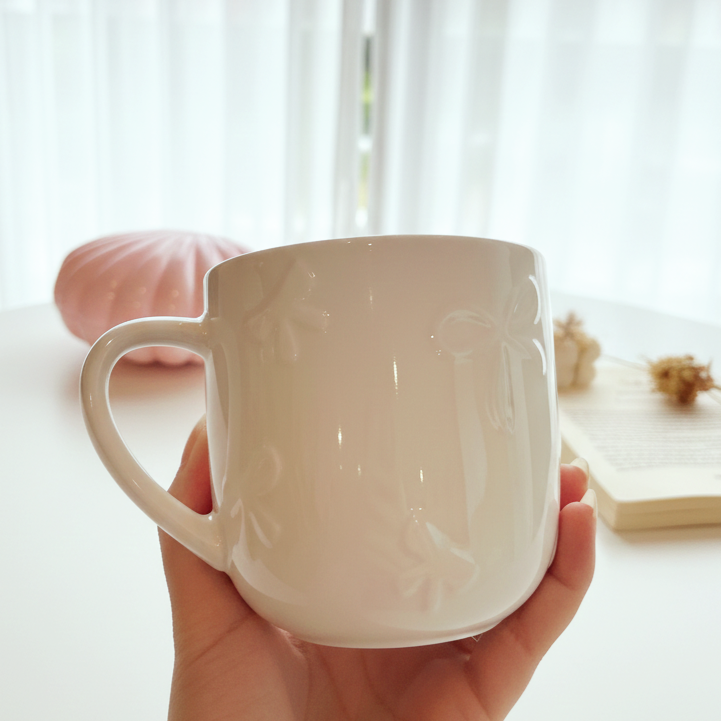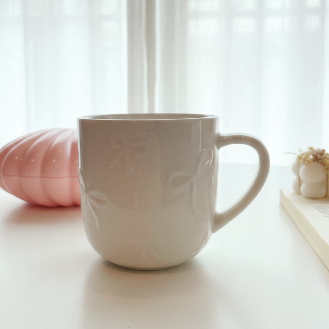 مج رقيق بلون أبيض عليه رسومات فيونكة بارزة شكله كلاسيك وأنيق