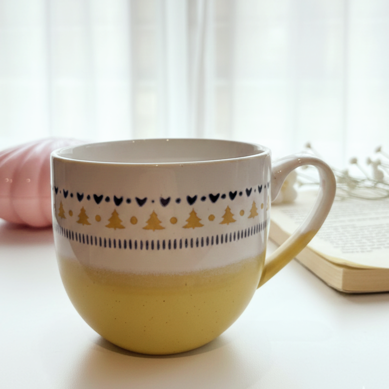 مج بلون أصفر*أبيض وعليه رسومات بأشكال مختلفة
