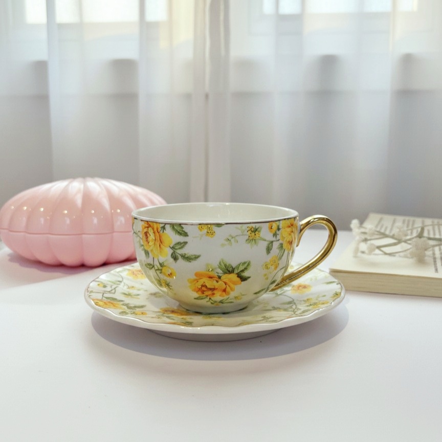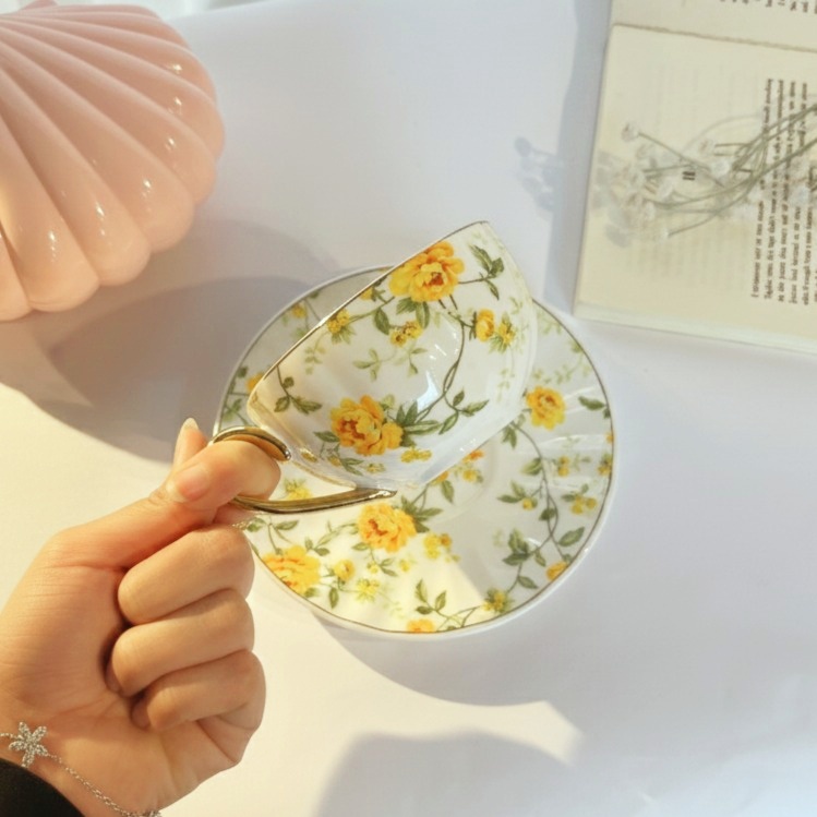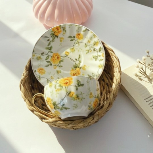 فنجان شاي أنيق وشكل كلاسيك بألوان الورد الأصفر هيبقى بداية جميلة لكل يوم