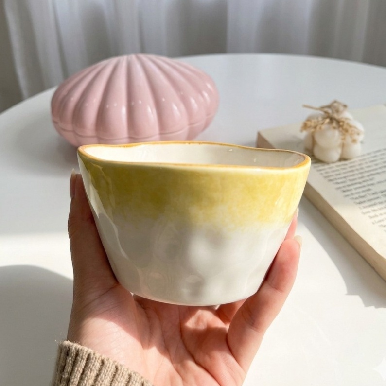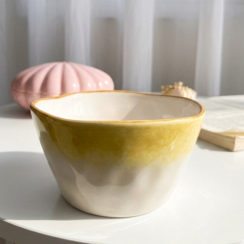 بولة مدرجة بلون أصفر وأبيض، شكلها كلاسيك وأنيق مناسبة للشوربة