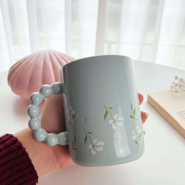 مج لطيف بألوان مبهجة وعليه رسومات ورد رقيقة وشكل إيده مميز