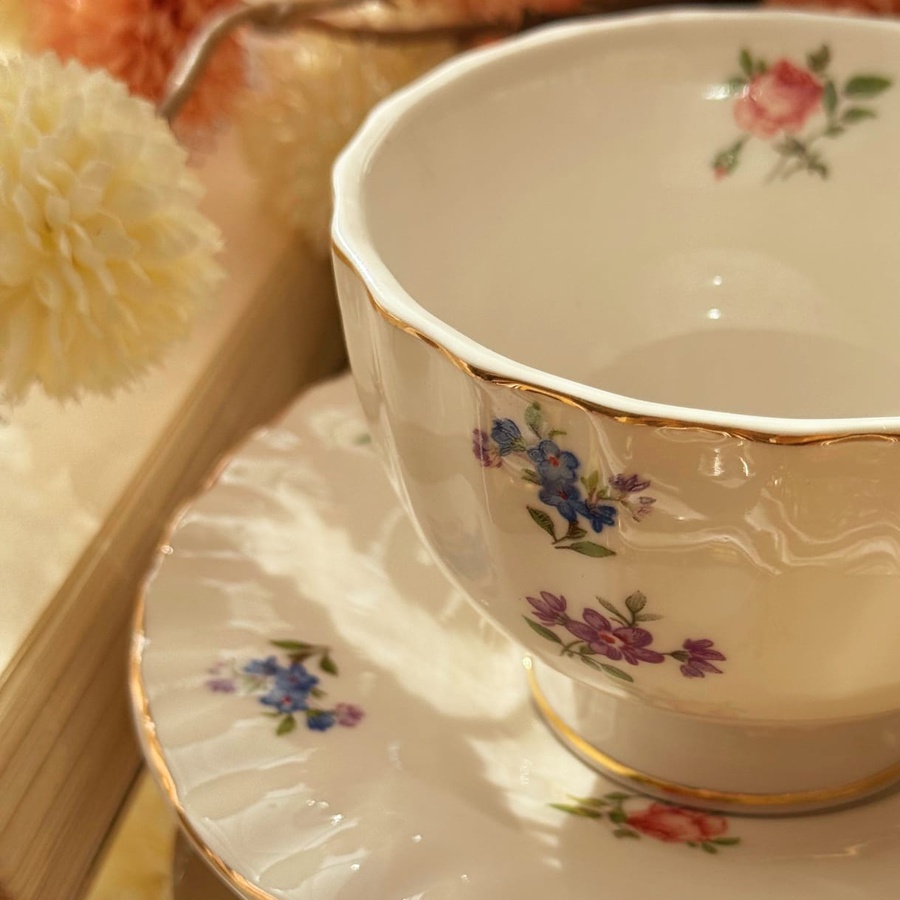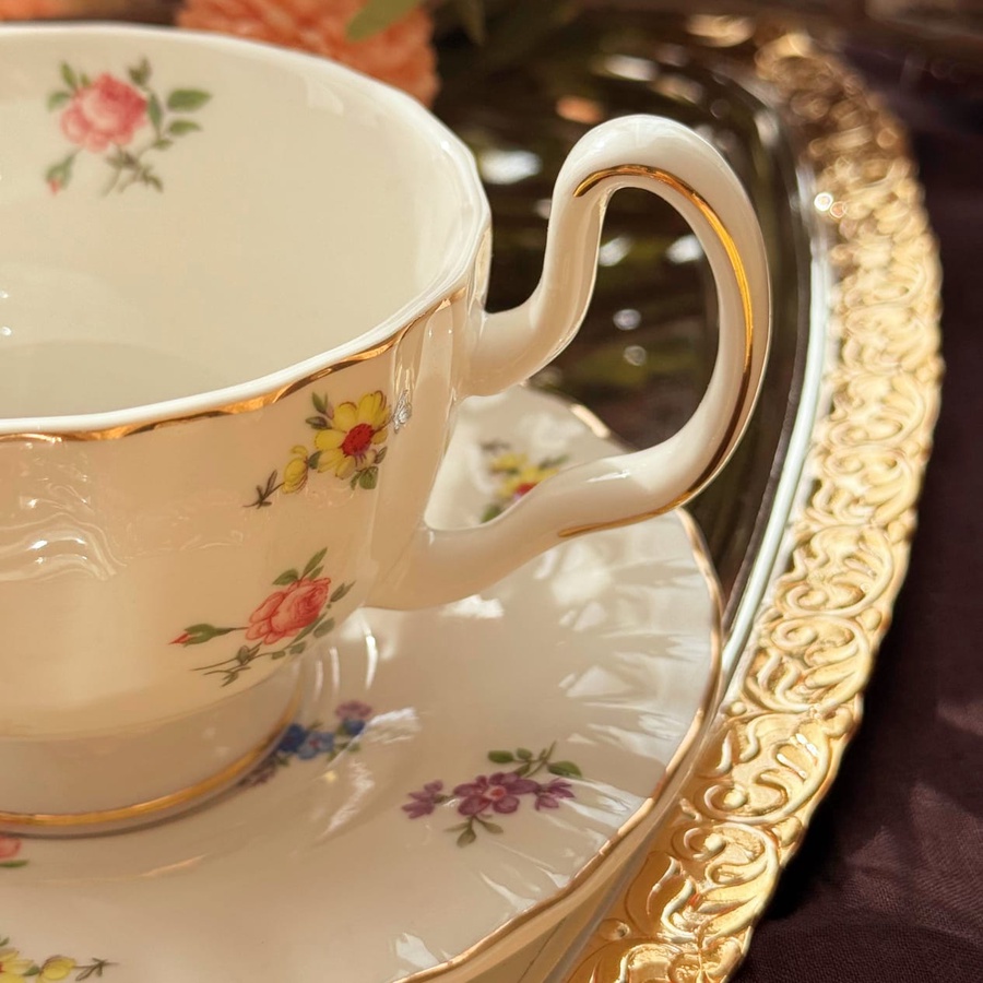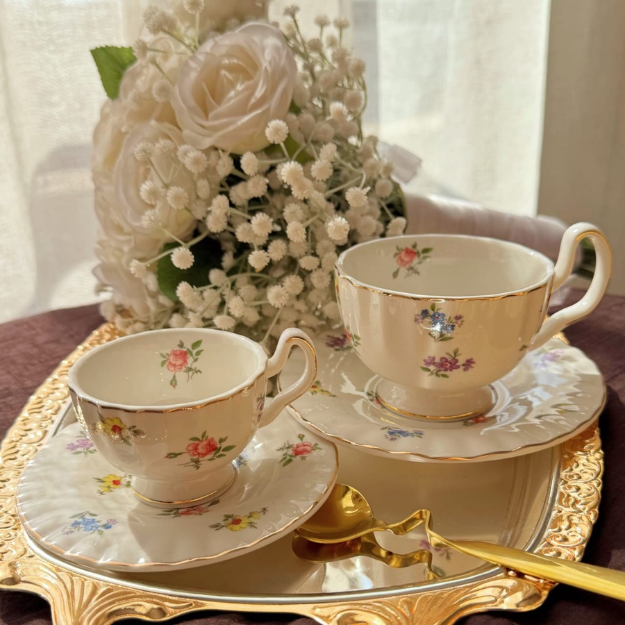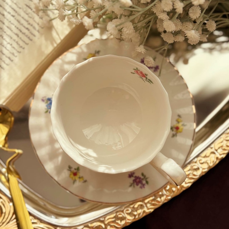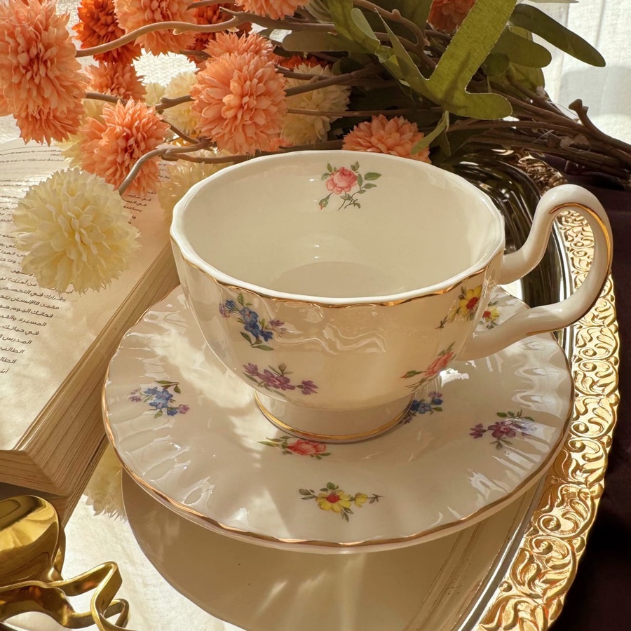 فنجان كلاسيك بلمسة ملكية مزخرف بنقوش زهرية ناعمة وأطراف مذهّبة مثالي لصباحٍ دافئ تصميمه مستوحى من الطابع الفينتج كإنه خارج من فيلم قديم
